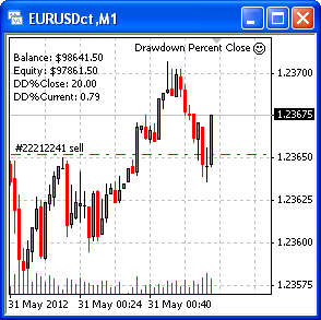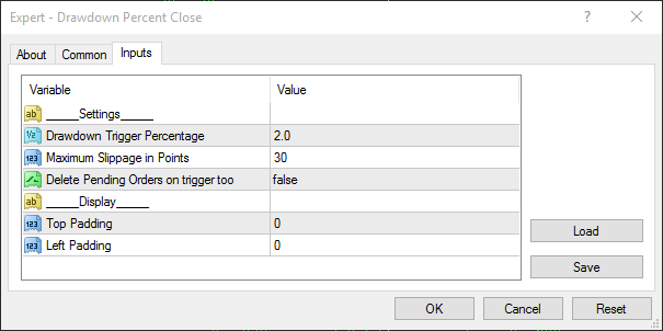 E.g. Balance = $10,000 and “DrawdownPercent” is set at 2.0, if floating P&L is greater than -$200.00, all Orders will be closed.