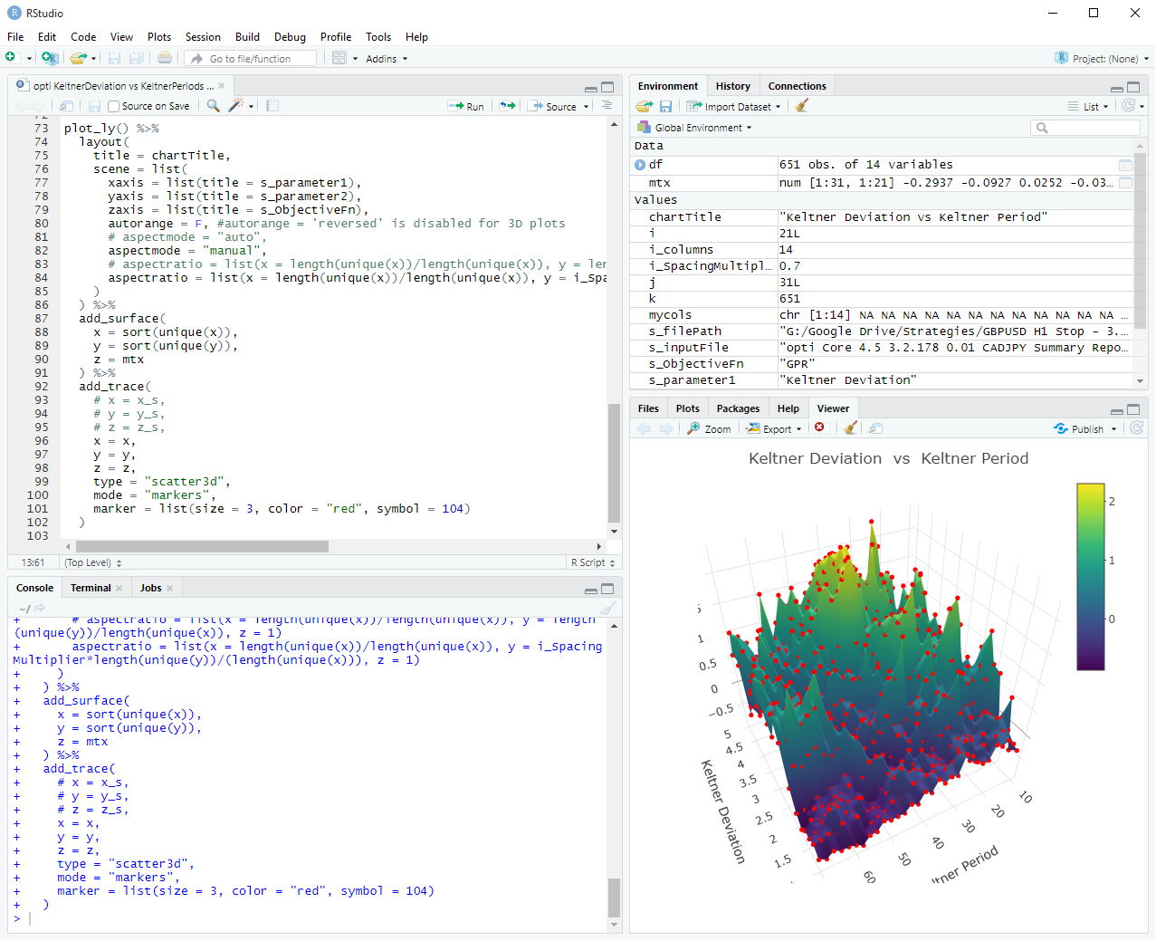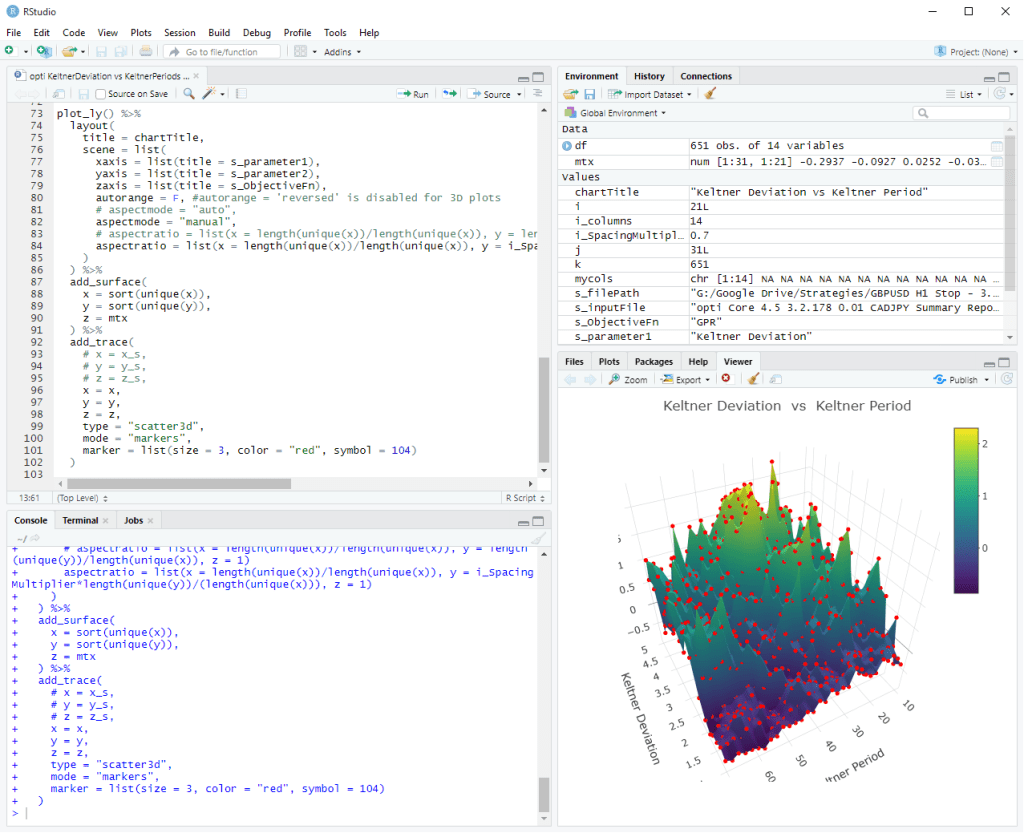The below illustrates a plot of “Keltner Deviation vs Keltner Period” data on the horizontal axes, with the vertical being the target performance score (in this case a simple Gain-to-Pain Ratio). The objective being that we want a high plateau, which indicates that even with some drift in the two features, we can still obtain a high performance score.